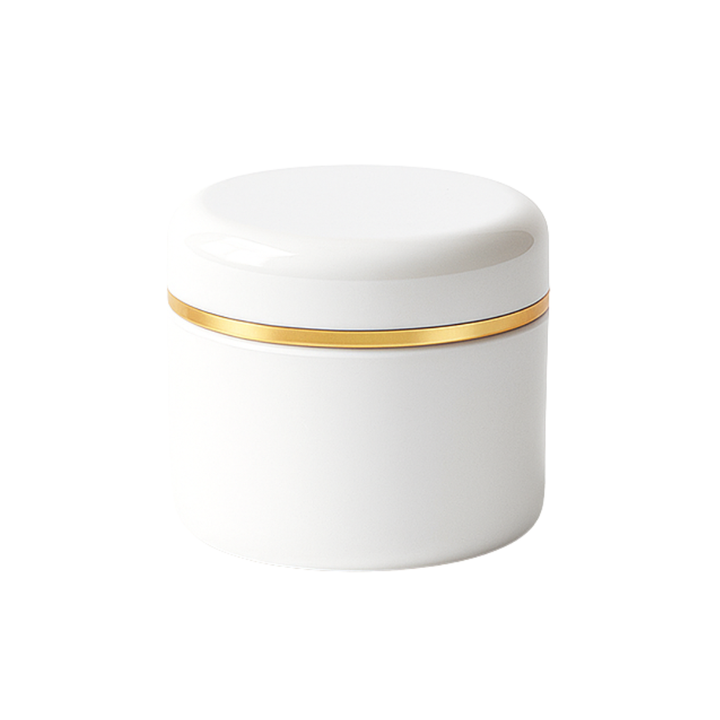 Den stilrena vita burken med gulddetalj rymmer 30 g handgjord mukhmaria, tillverkad i Sverige med utvalda kvalitetsoljor.